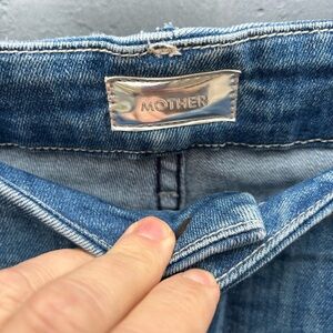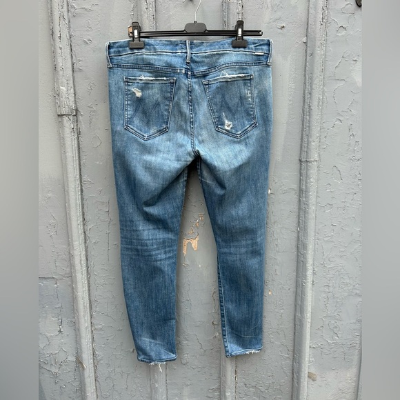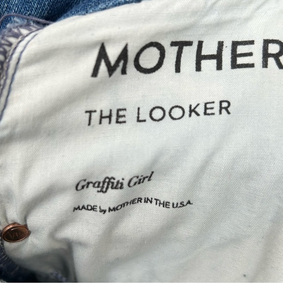 Mother The Looker in Graffiti Girl Vintage-inspired medium blue wash skinny jean with fading and distressed details.