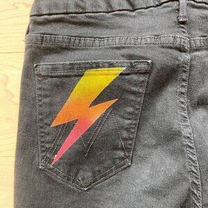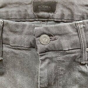 Keywords: Mother Womens Skinny Jeans Size 27 Distressed Black Denim With Lightning Bolt Pocket style cut 700478 high rise waisted gold bolt raw hems ripped knee stretchy black denim rebel jeans