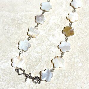 16 mm mother-of-pearl flower shell beads, 34 mm x 13 mm (1 3/4") silver color "Paw Print Heart Beat" pendant
