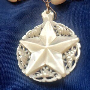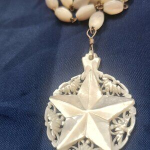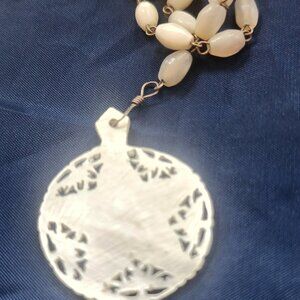 Small beaded Baroque mother of pearl in the size of a choker measuring 23 cms or the equivalent of 9 inches, doubled, with a star pendant mounted on a round carved disk plate of 2 cms or around 1 inch.