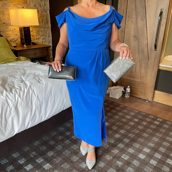 Beautiful royal blue. Flattering draping at bustline and at waist line. Small side slit to just above knee