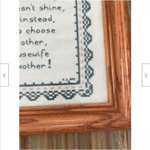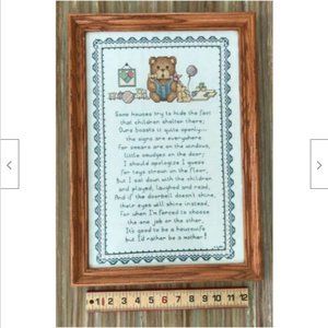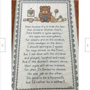 Vintage completed & framed cross stitch is Leisure Arts design #836, featuring a cute teddy bear motif with a heart-warming saying about motherhood. Has stitcher's initials & date in corner (N.S., 1997). Wooden frame measures 20" tall x 14" wide. Some wear to wood surface of frame (small scratches/marks).