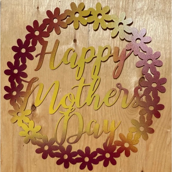 "Happy Mothers Day" flower wreath metal art indoor/outdoor wall hanging in shimmery yellow and red. Measures 14.5" in diameter.