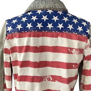 Cotton, long sleeve, Stars and Stripes print on shoulders, back and arms, metal button front, faded denim, two front flap pockets, (small stain on back, not clearly visible), EUC, neck to hem 19”, armpit to armpit 18”, armpit to cuff 20”