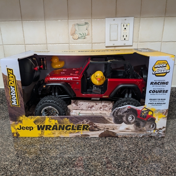 New. Experience thrilling adventures with the Jeep Wrangler Remote Control (RC) Car. Comes with the Red Jeep Wrangler, 2 yellow ducks, 2 batteries, RC Controller, and a USB charging cable for USB charging. Assembled Product Dimensions (L x W x H) 17.15 x 9.40 x 6.50 in.