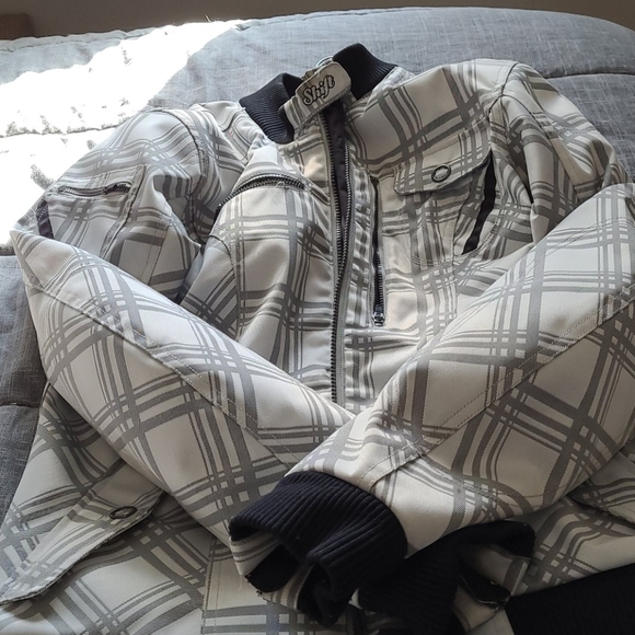 White with grey stripes. Elbow and back pads included. Too small for me.