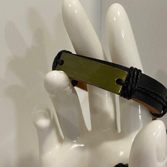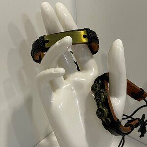 This bracelet features a rugged design with leather and metal elements. An adjustable cord ensures a comfortable fit for most wrist sizes.