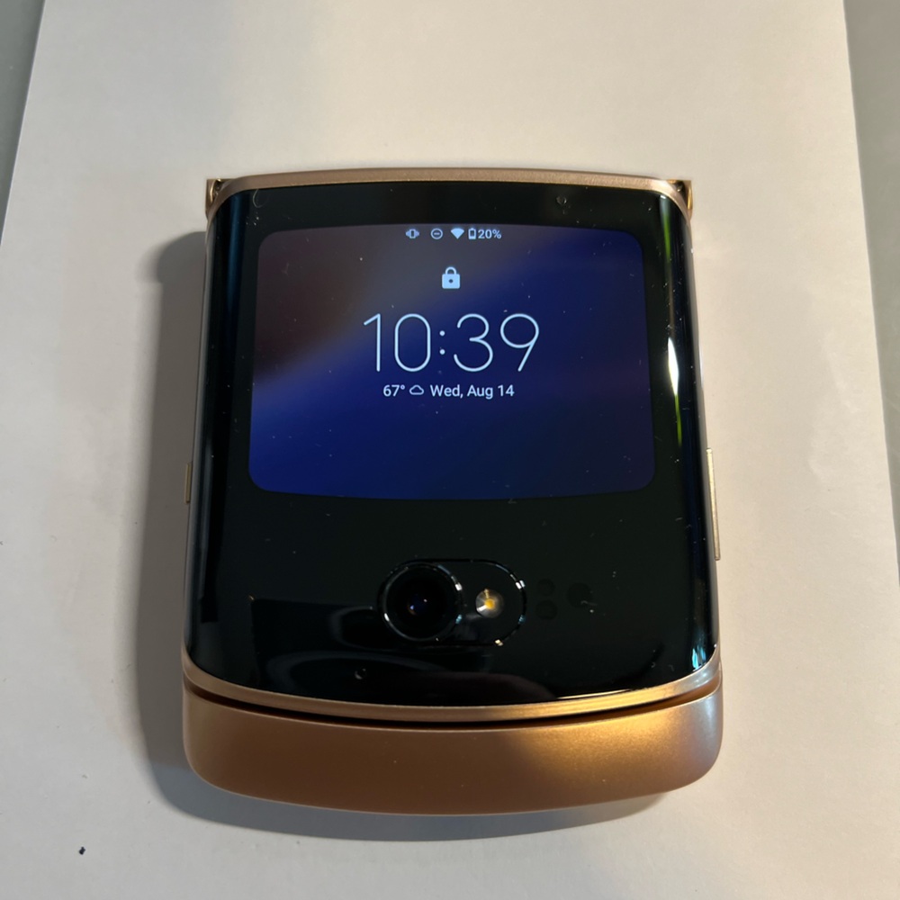 Selling my Motorola Razr Flip Phone. Model XT2071-4. 256GB. Fully Unlocked. Fully 5G compatible. Duel Sim. Gold with a light hint of dusty rose in Color. This phone is in absolute mint condition. Includes 2 leather look protector sleeves. Includes all original packaging and accessories as pictured and the original box. This was my back up phone and was rarely ever used. Perfect condition. Price is $550.00 and I’m pretty firm on that.