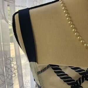 100% silk dress, shoulder strap design, navy blue and white rope pattern. Beautiful light and flowy dress. Pockets.