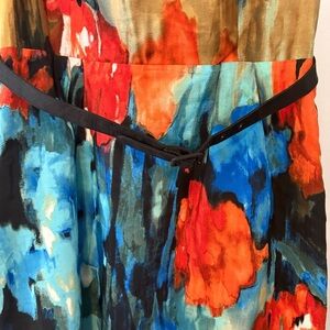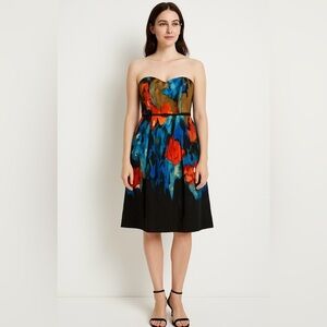 Vibrant and sophisticated, this Moulinette Soeurs strapless dress features a painterly floral print in bold tones of blue, red, black, and ochre. The bodice is lightly structured with a hidden side zipper and interior support band. The back features comfortable smocking for a flexible fit, and it includes a slim black waist belt for added definition. Lined in a soft polka dot fabric. A standout Anthropologie piece, perfect for weddings, events, or summer soirées.