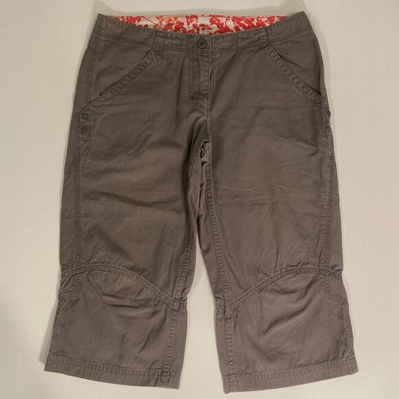 Climb every mountain, ford every stream or walk around town in these tough but stylish women's capris from MEC. Light grey with floral highlights on the inside waist band. Zipper, button and drawstring closure. Multiple pockets for carrying essential items. Gently used, in great condition, from a smoke-free environment.