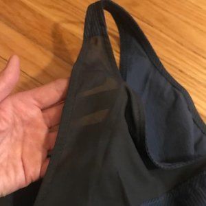 Super cute lightweight romper from Mountain Hardwear. Blue with black stripes - overall reads as navy. Pockets. waist tie that ties at back - note that one of the thread loops (1 of 3) that hold this tie is broken but it does not affect the function or look. Cute and perfect for summer.