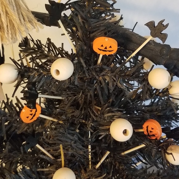 Poseable Skeleton was painted black along with tree and the tin tree skirt. Jute twine ponytails with little pumpkins and bats throughout tree with wooden beads.