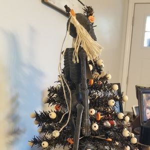 Poseable Skeleton was painted black along with tree and the tin tree skirt. Jute twine ponytails with little pumpkins and bats throughout tree with wooden beads.