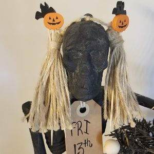 Skeleton is plastic and I painted it black and dusted white to give that stone look and he is wearing a tag around his neck....FRI 13th. String at back if you wish to hang Mr. Bones!!!