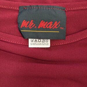 This top by Mr. Max is made of a polyester/spandex blend (92/8) in a dark red tone. To start, I'm not sure if this top is vintage deadstock or contemporary. Though it was made in Canada, it appears the brand is still being sold through TSC and similar channels in other countries. The top has 3/4 length bell-style sleeves with a sort of pleating/crepe style lines running vertically in them. The neck is round and the fabric has a nice stretch to it, making the top a comfortable piece to wear. There is little wear, which is what made me think it might be deadstock.