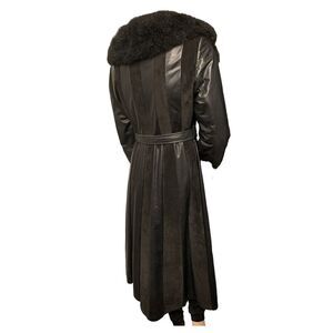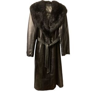 Mr Sabre rare and vintage leather coat in amazing used condition has next to no wear. There is an Aline design with a fur collar. Has string inside for closure which ties to the button hole. The sleeves are looser and the inside has a hood liner for the cooler months. Has a gorgeous suede and leather vertical feel is so beautifully made the craftsmanship is impeccable. This item is rare and will make a fashion statement with class. Not major wear to mention just some creases and minor scratches not noticeable at all overall condition is super amazing for the vintage vibe. Please refer to all photos shown for flaws the size says 14 but fits mor like a medium due to vintage sizing.