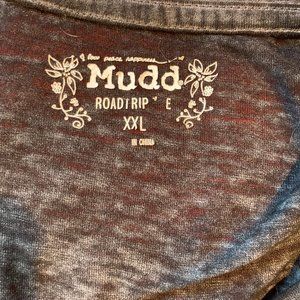 Gently used Mudd Burnout Roadtrip tee in black with small side slits and a straight cut.