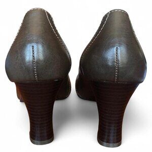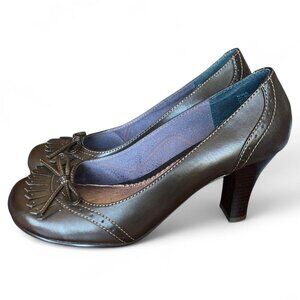 β’vintage Y2K chocolate brown faux leather MUDD dark academia fringe bow pump heels πβοΈ