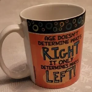 Orange and Black Coffee Mug with script ' Age Doesn't Determine Who's Right It Only Determines Who's Left' Made by Russ Berrie Gift U.S. Inc
