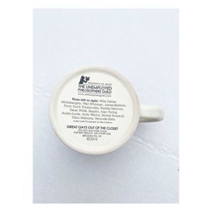 Produced in 2012. A tribute mug titled “Great Gays Out Of The Closet” by The Unemployed Philosophers Guild. A list of individuals is noted on the base of the mug. 3-4 nicks of black lost, less than 1mm each. No chips or cracks. Care requires this mug be hand washed.