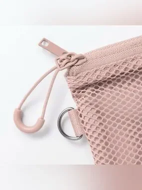 Lightweight mesh pouch for cosmetics and small items. Top zipper closure with attached loop and metal ring. Breathable fabric keeps contents visible. Simple, versatile design for daily use.
