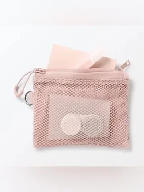 Elegant pink mesh bag by Muji. Ideal for cosmetics. Lightweight and portable.