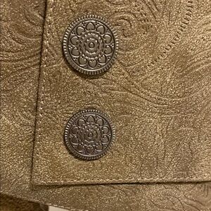 Featuring a chic brown tan colour, intricate embossed design and silver button detailing.
