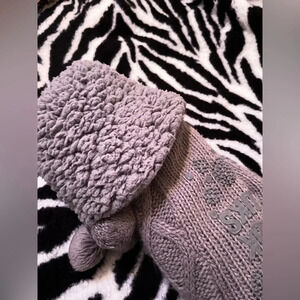 These cozy gray mukluk socks feature a soft, knitted design with a playful pom pom on the side. The bottoms are equipped with gripped non-slip soles for extra comfort and stability. The socks are in good used condition, with one pom pom missing, but they still offer warmth and style for chilly days. Ideal for lounging at home or adding a touch of comfort to your winter wardrobe.