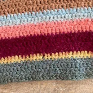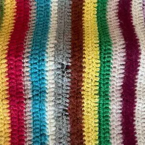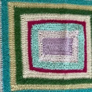 Multi Color Knit Blanket/Throw. Beautiful vibrant colors. Possibly crochet ?? Soft and cozy. Very good pre owned condition. Wrap up to keep warm or use as accent to add a pop of color. Washes nicely in cold water. Some waviness on edges. A couple of spots where the stitches are loose as shown in pics.