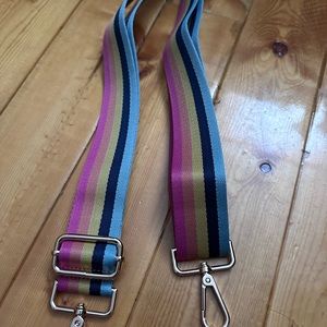 Interchangeable rainbow stripe bag strap in shades of pastel pink, blue and yellow with adjustable length.