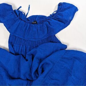 Deep cobalt blue ruffled 100% linen maxi dress. There are at least three ways to wear it! Effortless, epic summer dress.