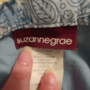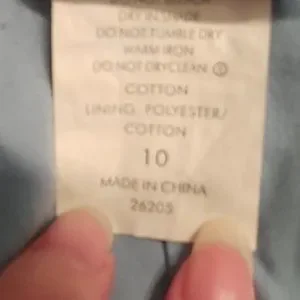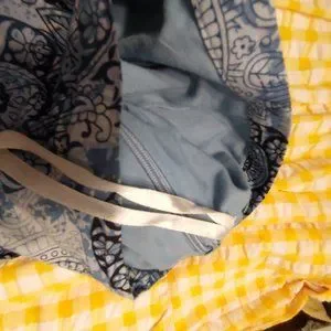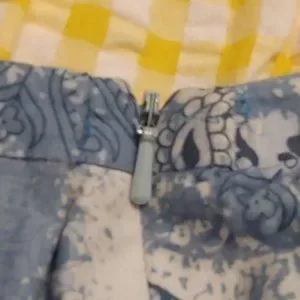 A three tiered, mid length, lightly ruffled skirt with several different prints on a blue and white background. Also has a zipper on the side and hanger ribbons, well loved and good condition.