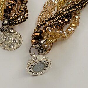 9 Strands of various sizes and shapes of glowing iridiscent hues of brown, beige and gold from the faceted tiny glass seed beads strung on each strand