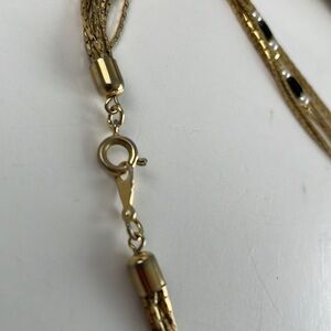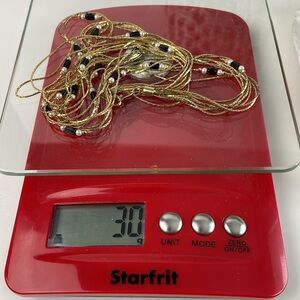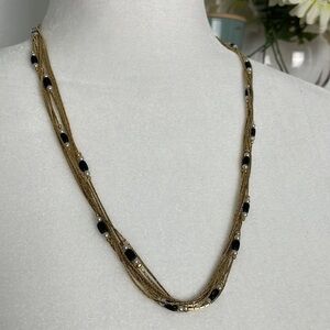 8 strands of box chain with faux pearls and black beads strung a long the chains. Very elegant and timeless vintage necklace. Good condition. Bundle to save.