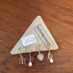 Brand new hoop earrings with gold, purple, and pearl charms accents.