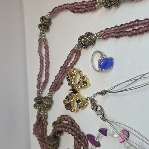 This elegant jewelry set features a stunning array of colors, perfect for any occasion. The set includes necklaces, bracelets, and earrings in shades of purple, pink, and silver. Add a touch of sophistication to your outfit with this beautiful collection. Lotb62