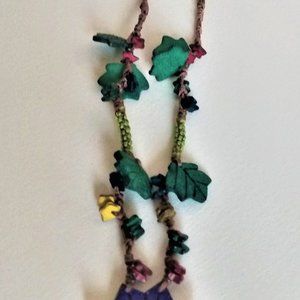 Colorful, Bright Handmade Coconut Shell Flower and Rope Necklace. Purple Flower with Pointed Petals and Large Center. Accented With Coconut Shell Leaves and Various Colored Chips. Rope is Copper In Color With A Small Amount of Green Braided Into It. Size Ranges From app.17" - 19" Necklace Will Extend To app. 24"- 26". Flower Is 2.5" x 2.5". Color Of Coconut Chips Could Differ From Listing Picture, (more of one color).
