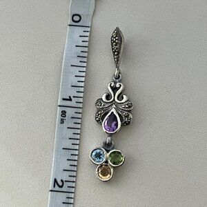 Amethyst, Citrine, Blue topaz, Peridot & Marcasite. Here's a lovely sterling silver dangle earring featuring multiple gemstones in different colours.