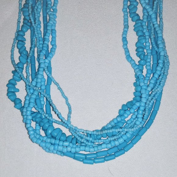 Nice Mix Of Blues, Multi-Strand Choker. Made up of Seed/Tube/Round & Faux Stone Beads With Bronze Colored Accents & Silver Tone, Lobster Claw Clasp. Total 9 Strands. App.19" When Open. In New, Unworn Condition.