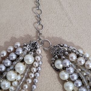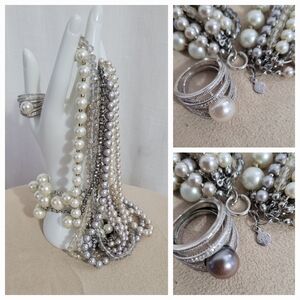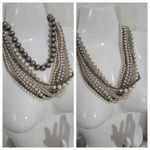 This stunning multi-strand pearl necklace features a blend of silver, cream, and gray pearls. Perfect for adding a touch of drama or bold feminine touch to any outfit.