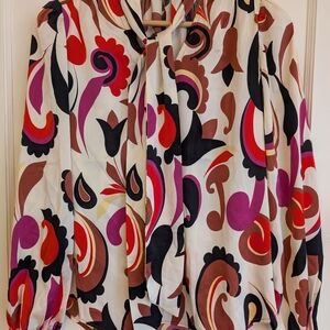Chic blouse with bold abstract patterns. Features vibrant colors and elegant design. Perfect for any occasion.