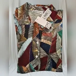 Elevate your style with this vibrant multicolor abstract pattern top. Perfect for any occasion. pet free