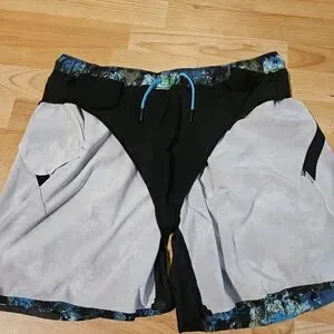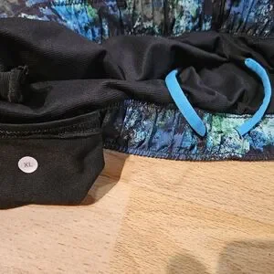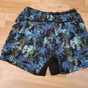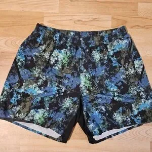 Stylish shorts with a vibrant abstract print. Features shades of blue, green, and black.