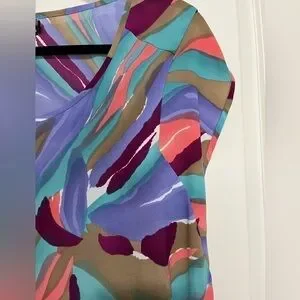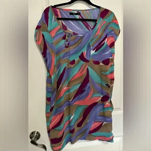 Vibrant mini dress or tunic with abstract pattern. Features a mix of colors for a bold look.cute buttons / snap closures.