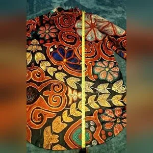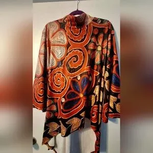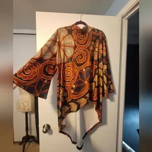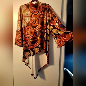 Stylish tunic with abstract patterns. Features a high neck and asymmetrical hem. Great colours, looks awesome with jeans. Never worn. Ptp 25" Length in front from shoulder 25" - 29" Length in back from shoulder 41"