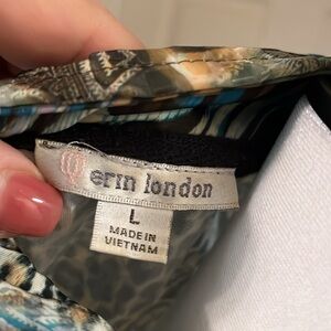 Unique multi-coloured women’s jacket. Unlined. Zip front. Pretty blue tones combined with animal print. The fabric is light and has a shine to it and could be dressed up or down. No pockets. Made by Erin London. Size large.