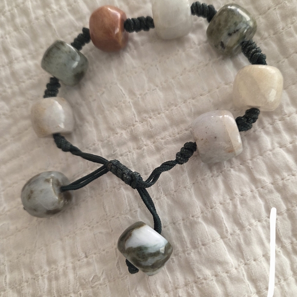 Jade bracelet with multicolor stones. Features a dark green cord.