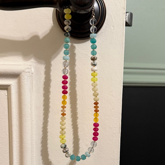 Add a splash of color to your ensemble with this multicolor beaded necklace. Featuring vibrant pink, yellow, and blue beads, it's a perfect accessory for any occasion.