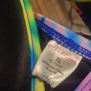 Vibrant multicolor bikini set perfect for a stylish beach day. Features a size XL colorful top and a solid blue size small bottom.